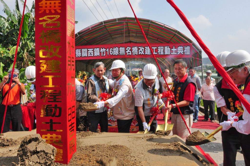 關西鎮竹16線「無名橋」自53年竣工至今,已有50多年歷史,因護欄多處鏽蝕及鋼筋外漏情況嚴重,有行車安全疑慮,經縣府與專家學者評估後,需予以重建。10/29日縣長邱鏡淳前往執鏟,進行改建動土典禮,工程總經費1億4100萬元,預定以300個工作天完成。邱縣長焚香祝禱工程順利、人員平安。